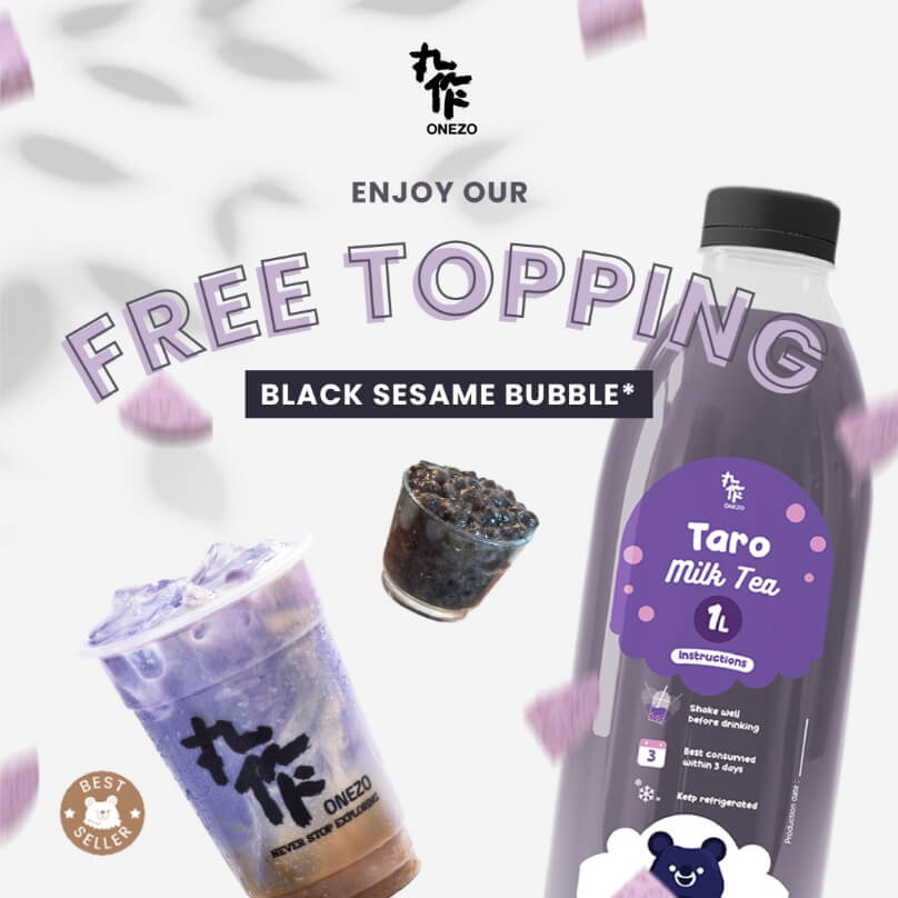 Jangan sampai kelewatan HOLIDAY PROMO dari OneZo ya. Ada FREE TOPPING Black Sesame Bubble untuk pembelian produk TARO MILK TEA ukuran medium, large dan juga 1L. HOLIDAY PROMO ini berlaku mulai 1-30